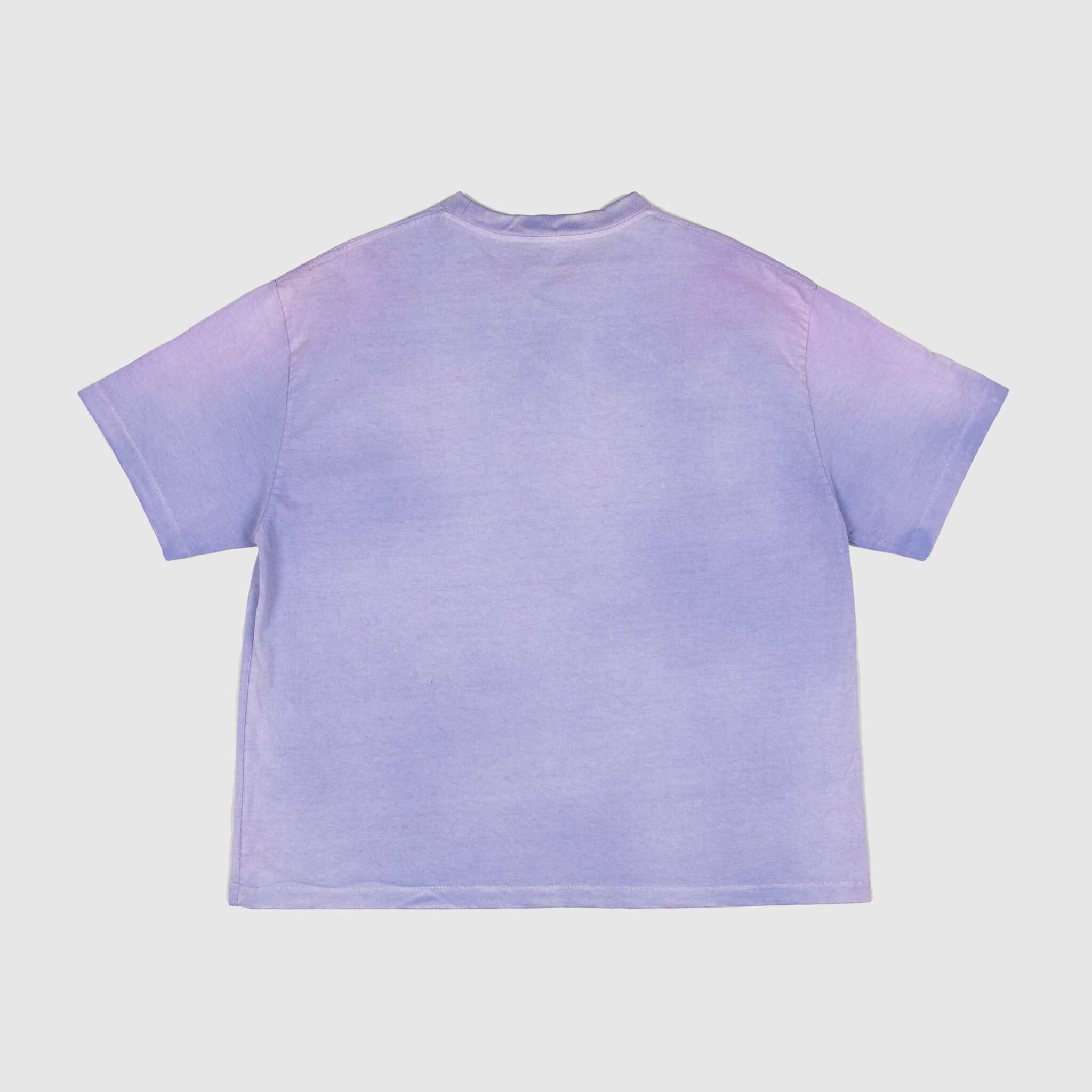 The shirt featured in our 34 Broadway film. Sampled in various different fabric weights and sprayed with different solutions of potassium permanganate. The shirts were sprayed with a pocket sewn on, then removed post wash. Some units were then screen printed inside the mark left from the removed pocket. Size large only, due to the spray and wash process each piece is individual and unique.