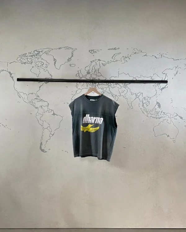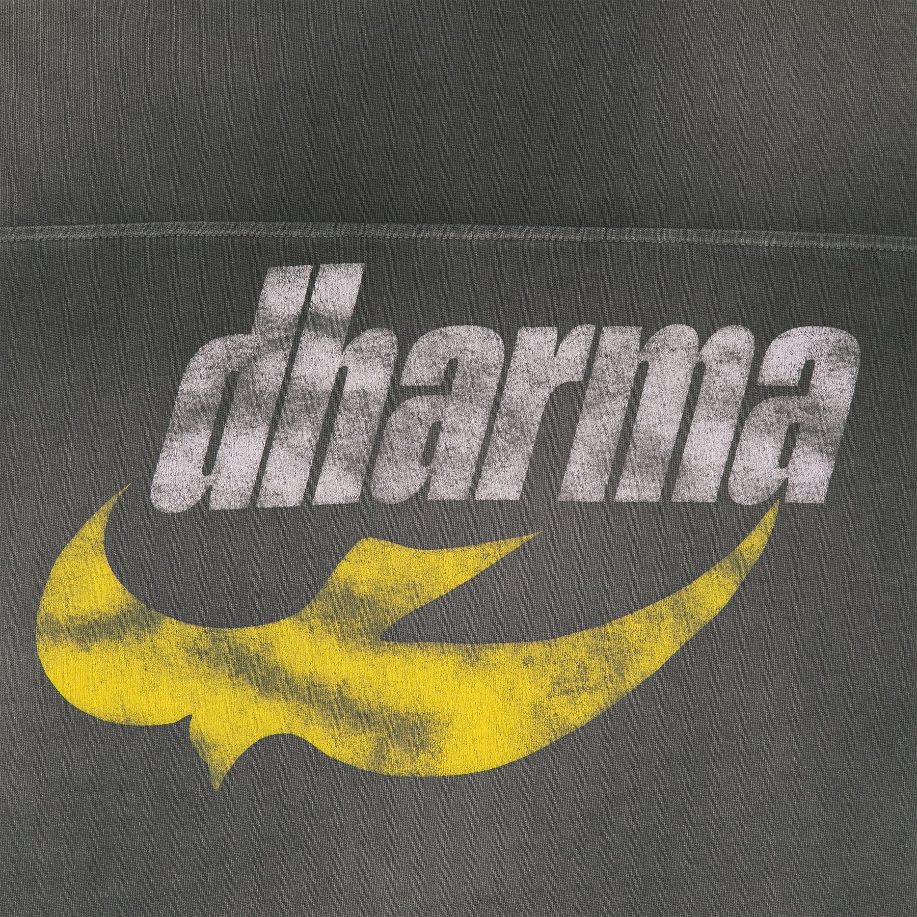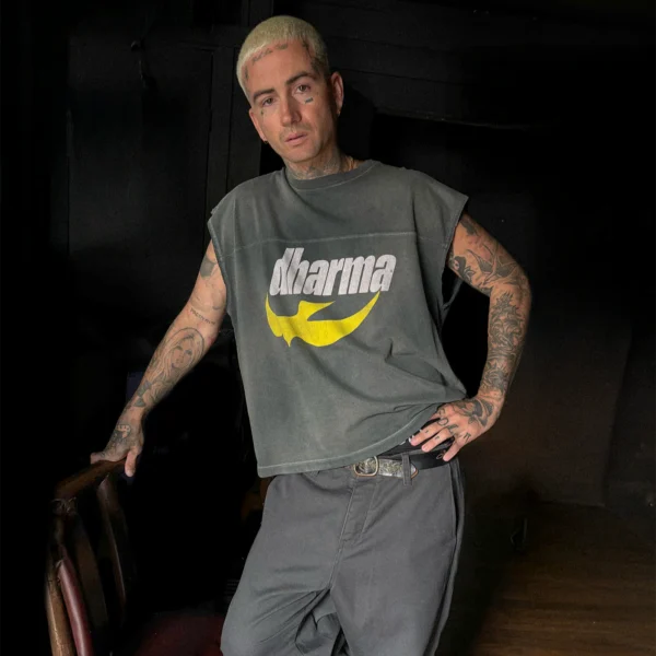 The dharma tank is made using our original body and silhouette from the football tee. it’s dyed and washed to achieve a unique and individual look for each garment. the dharma graphic is faded and distressed differently on each shirt and that is the intention.