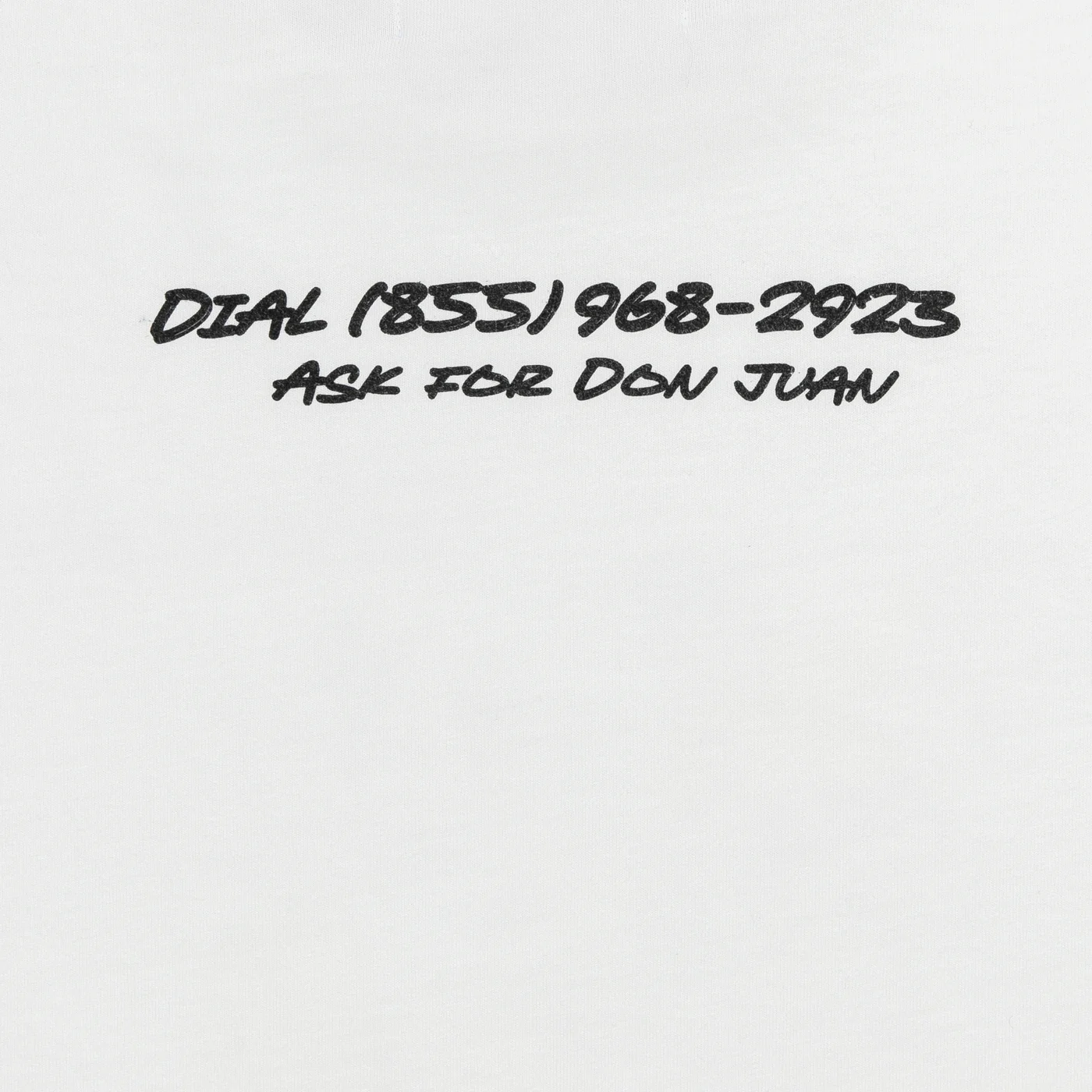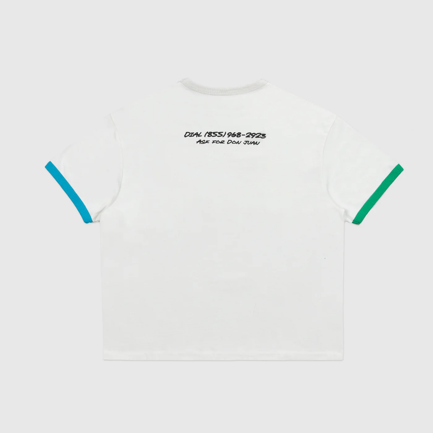 The Don Juan tee features a cactus cowboy distressed print on chest and phone number graphic on back with contrasting ribbing on the cuffs of the sleeves. Each one of these garments undergoes a unique wash and dye process, and graphic fading. Each garment has its own characteristics and that is the intention.