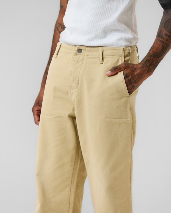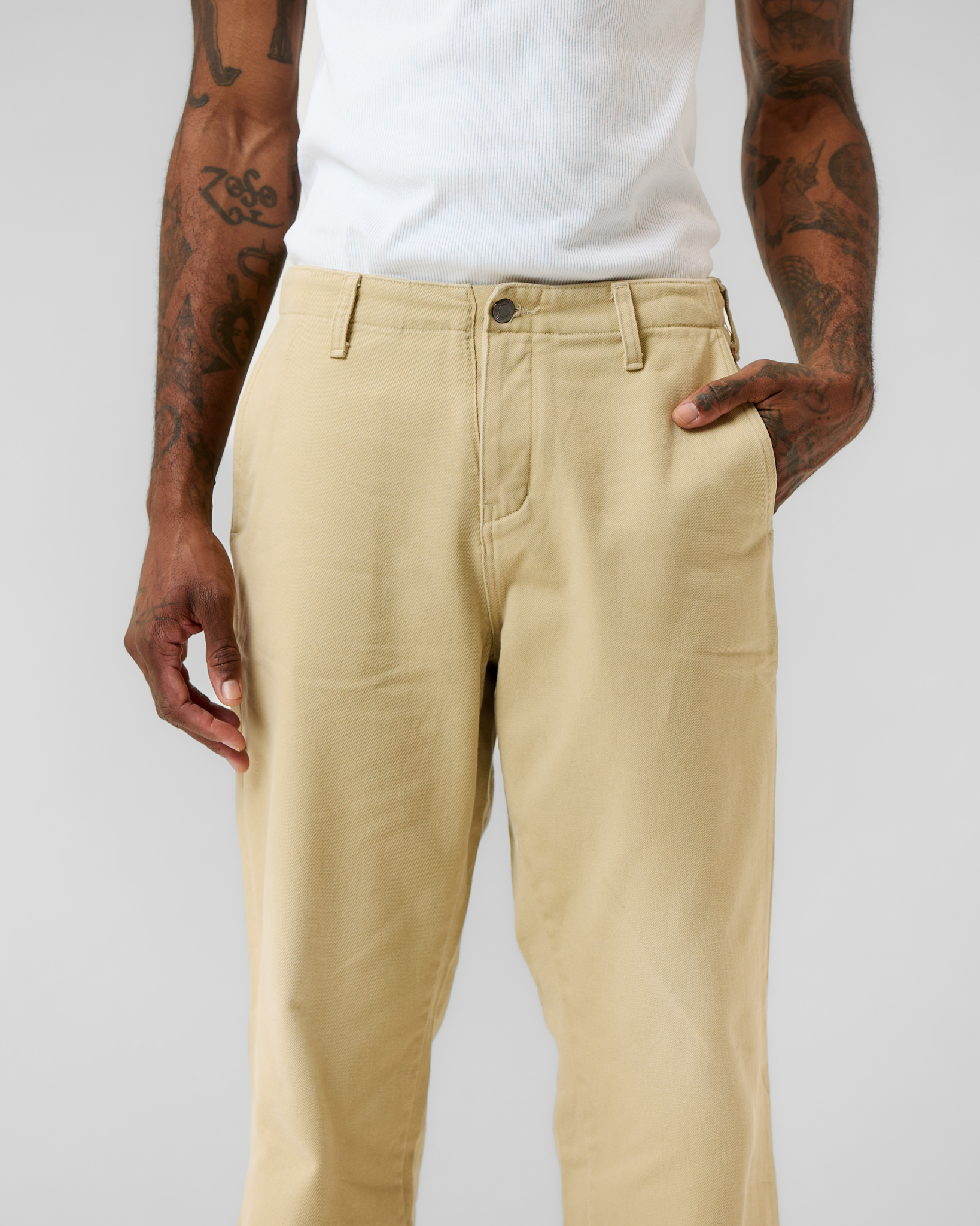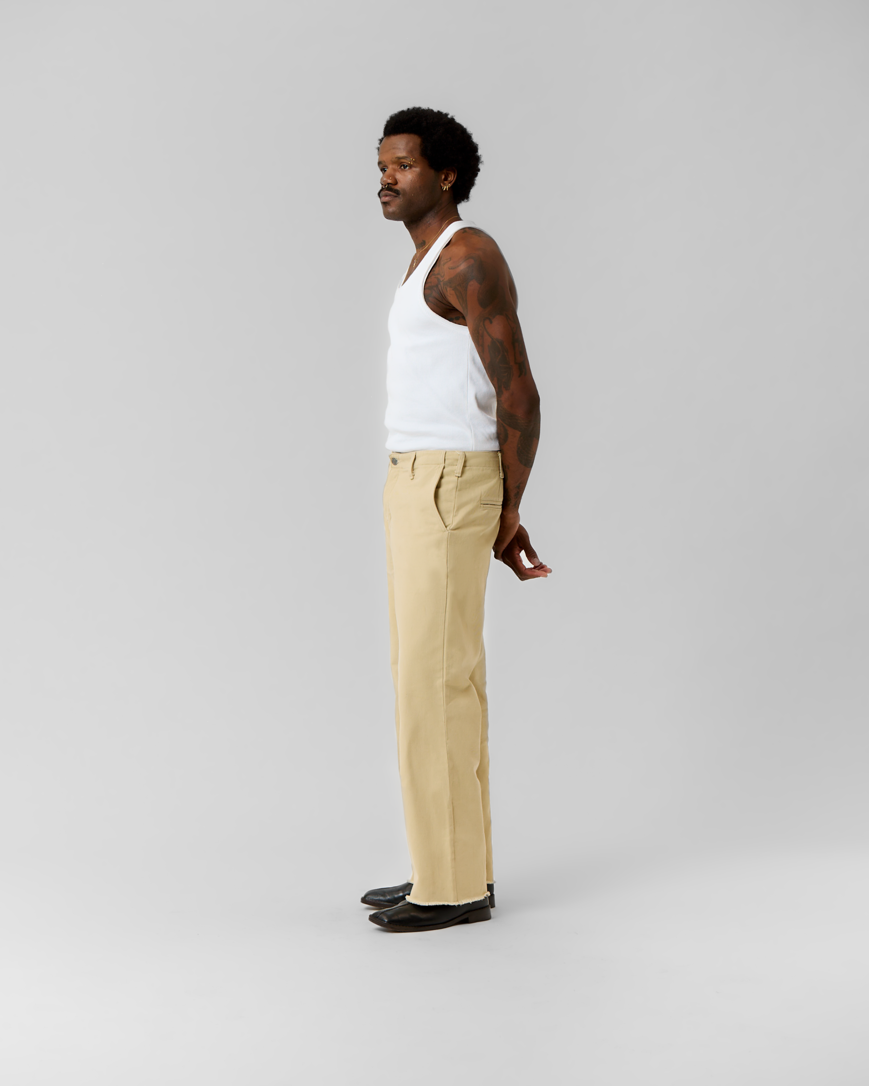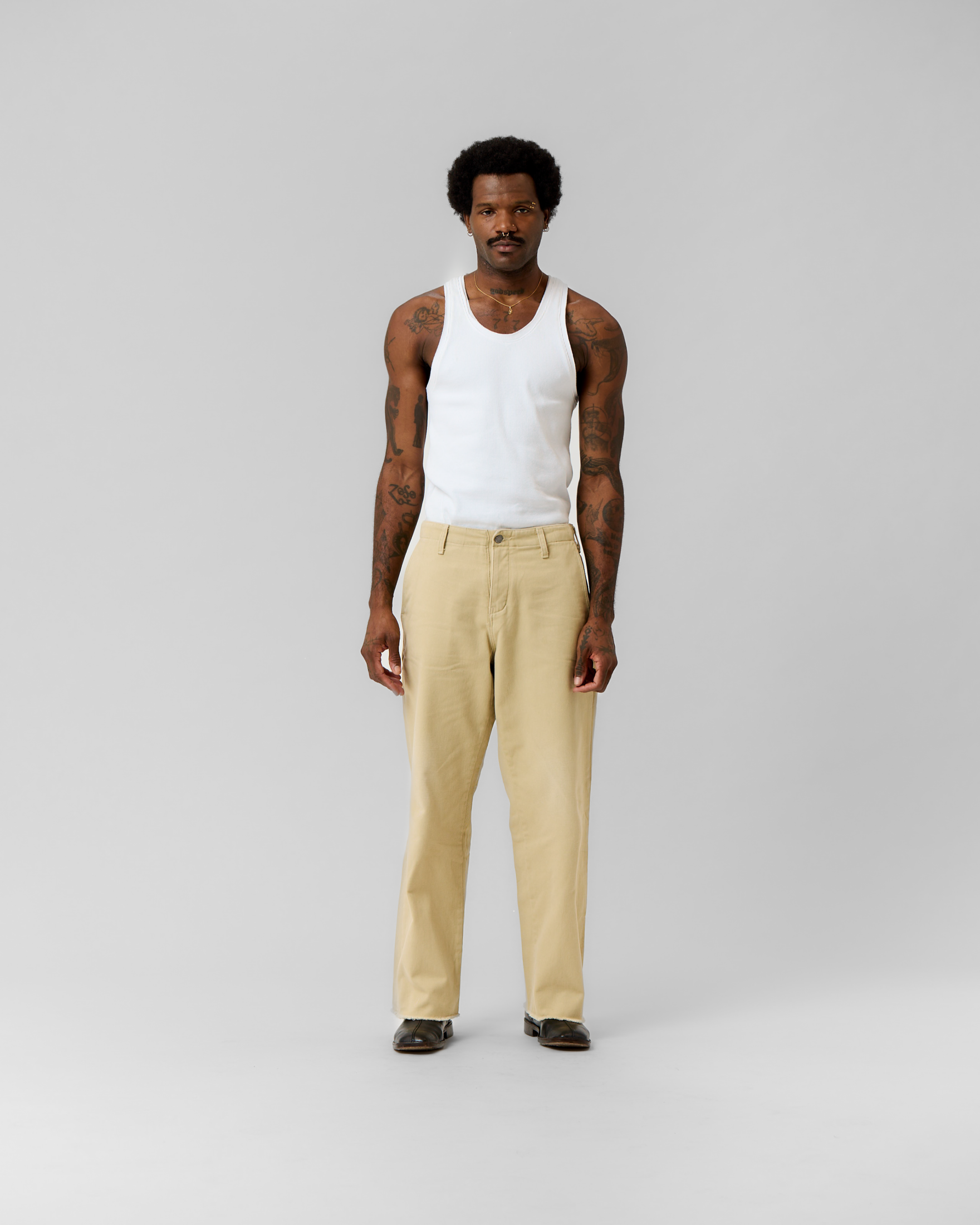 Relaxed fit 100% Cotton twill trousers. Raw edge finish with a vintage wash. Each one of these garments undergoes a unique wash and dye process. Each garment has its own characteristics and that is the intention.
