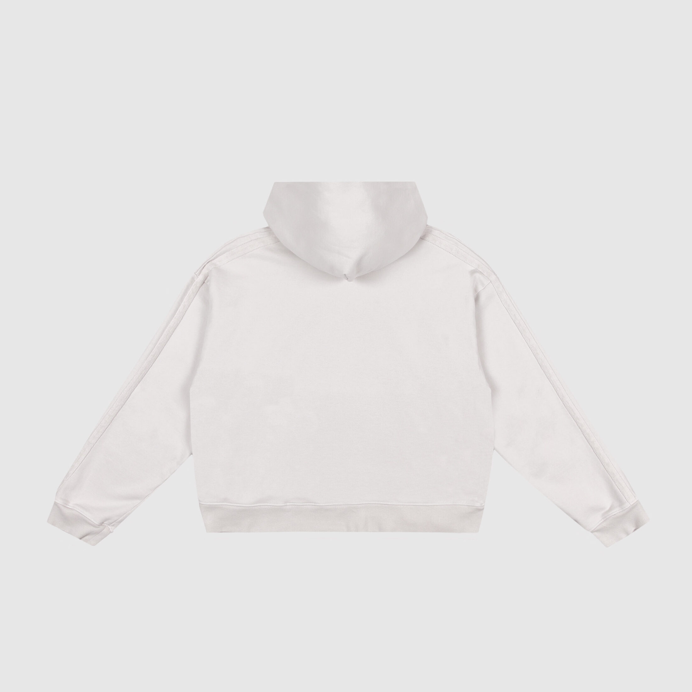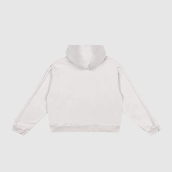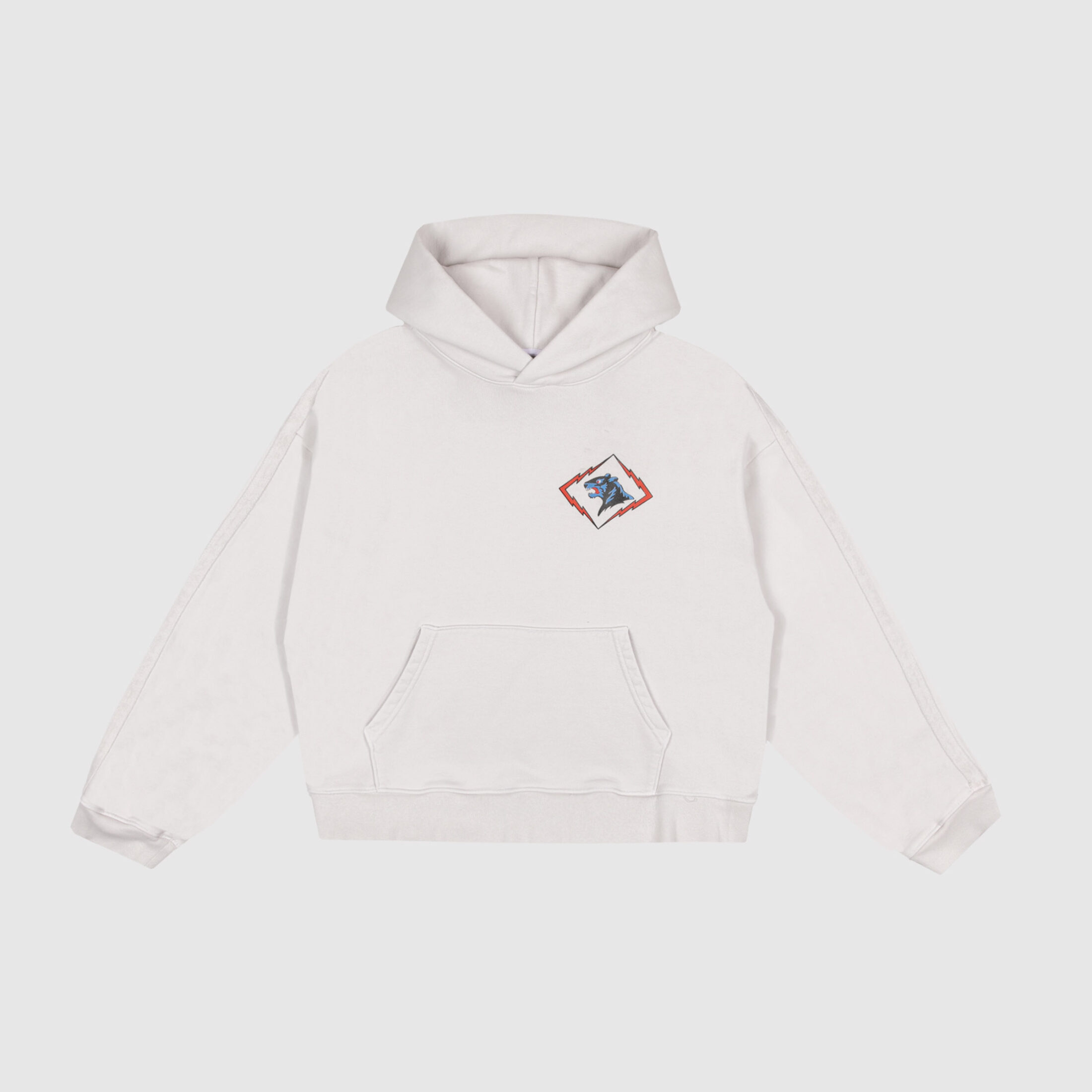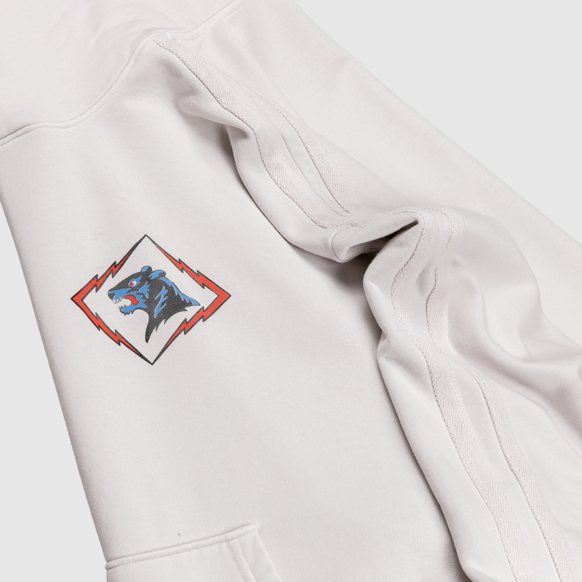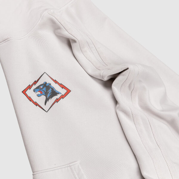 The Dead Atlantic Chapter 1 hoodie focuses on shape and feel. The overall silhouette of the Panther Hoodie is slightly cropped and oversized with full length cuffs and no drawstring on the hood. The sleeves feature a reverse self stripe to give it an iconic twist that is uniquely Dead Atlantic. The panther graphic pulls inspiration from military icons and collegiate sport logos.