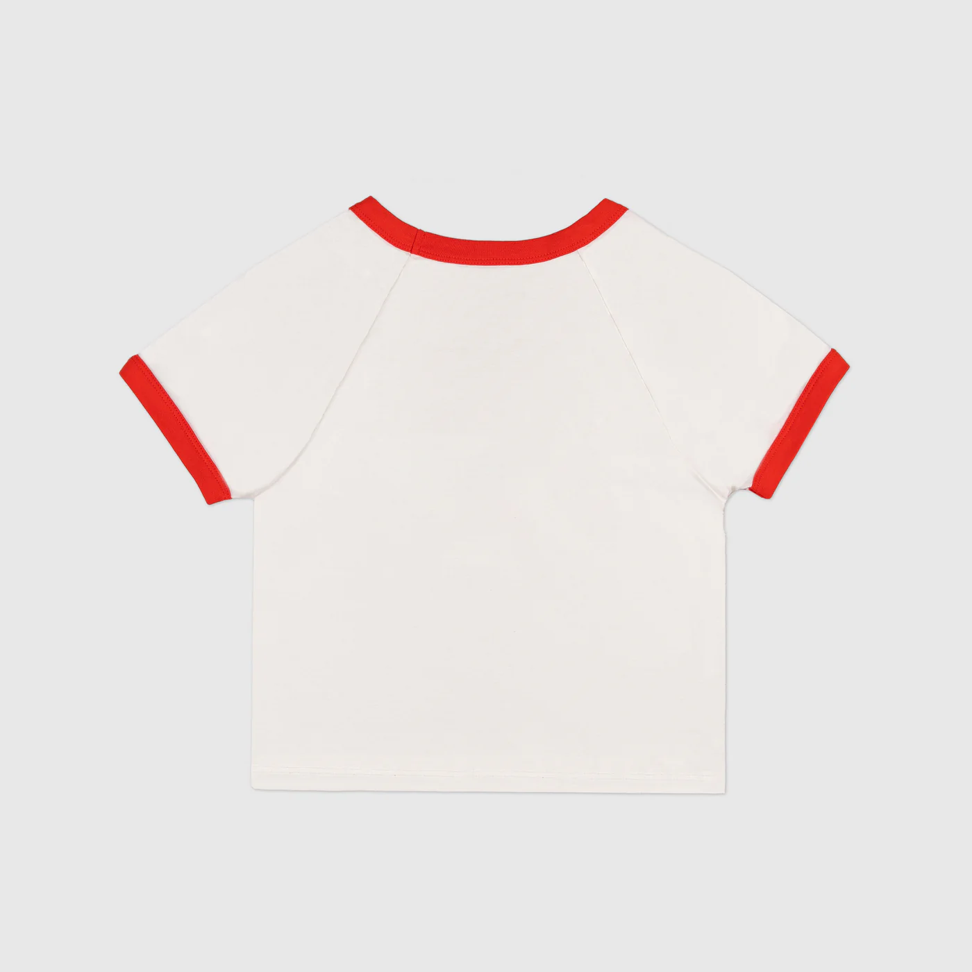 The Venice baby tee features red contrast ribbing on the cuffs and neck with a retro Venice bulls graphic and DA motorway logo.