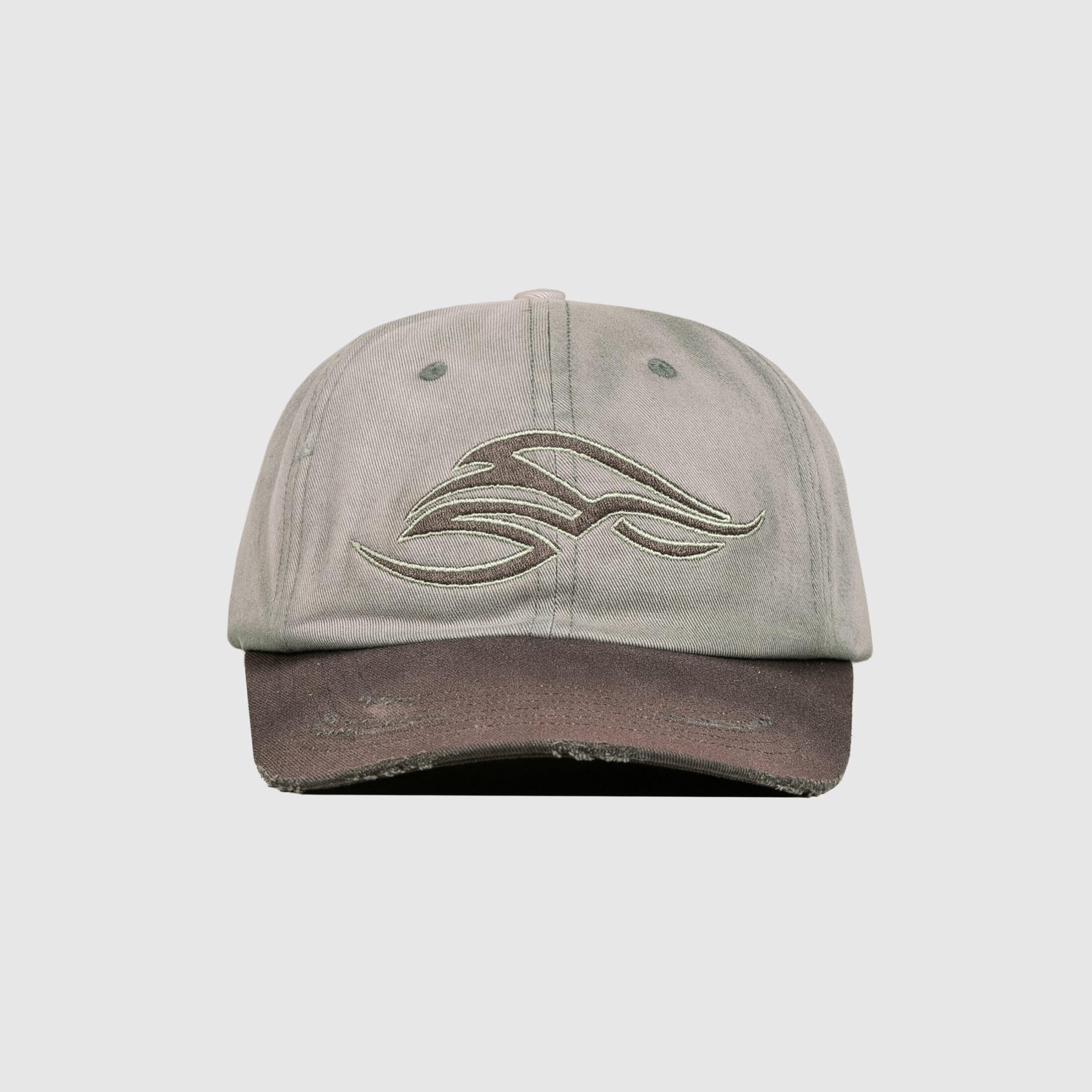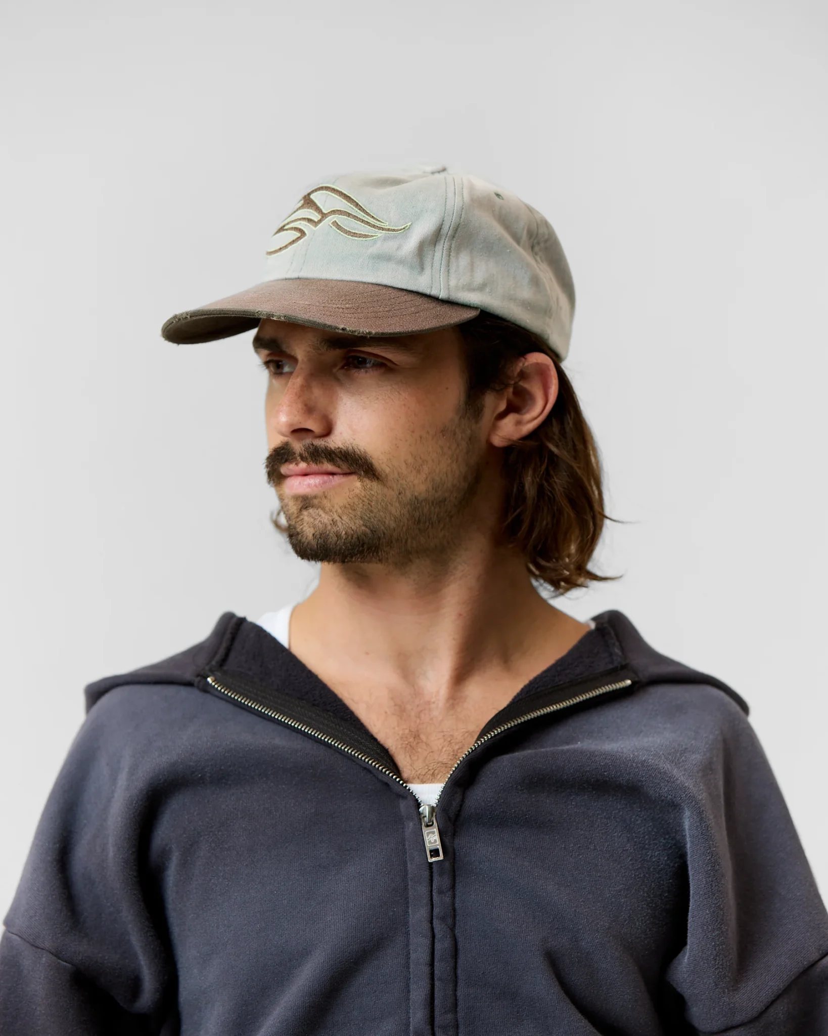 The wave hat uses an abstract wave design and light distressing to give a timeless vintage feel to this piece. We crafted a classic two-tone design by giving it a soft washed stone color body and a darker brown bill. Each one of these garments undergoes a unique wash and dye process, distressing, and fading. Each garment has its own characteristics and that is the intention.