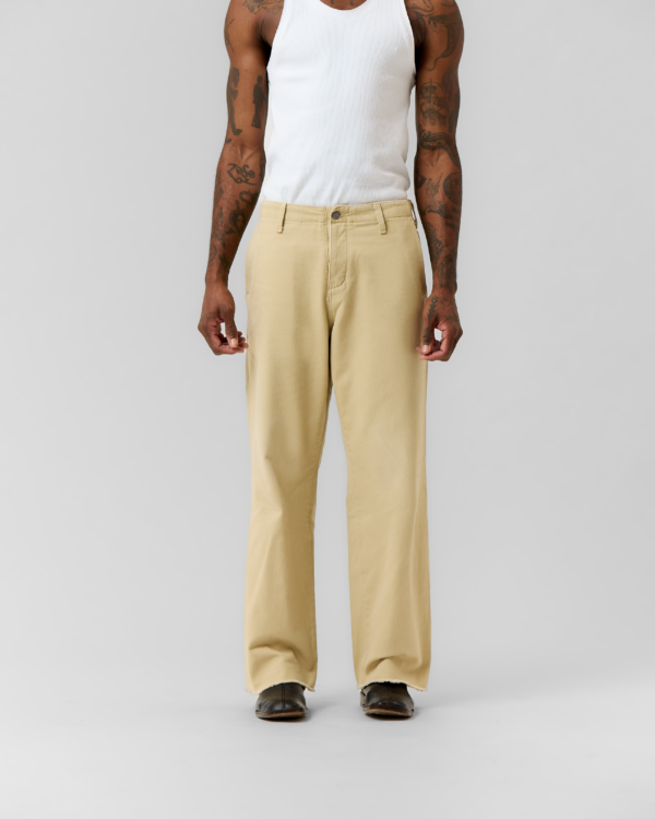 Relaxed fit 100% Cotton twill trousers. Raw edge finish with a vintage wash. Each one of these garments undergoes a unique wash and dye process. Each garment has its own characteristics and that is the intention.
