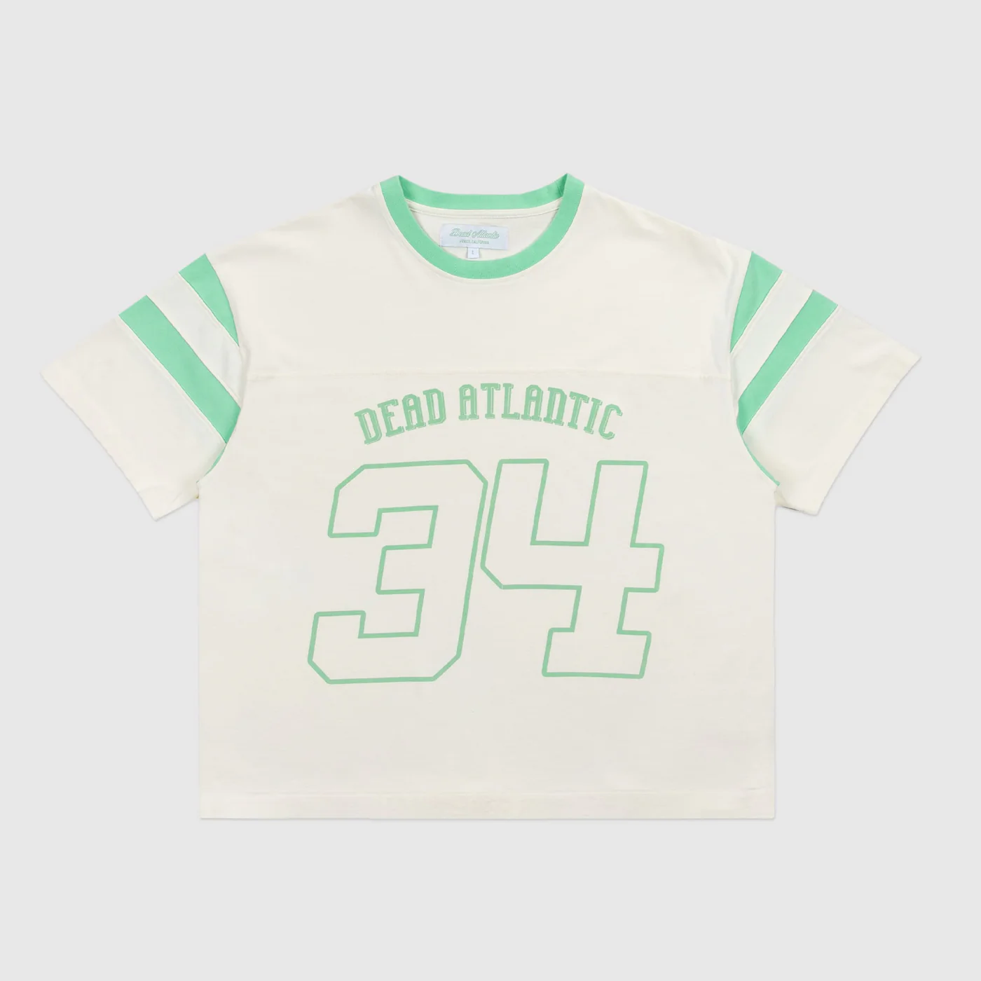 The football t-shirt is inspired by the classic football jersey silhouette. It uses a natural color off-white dye and faded stripes and neck ribbing with distressed graphics to echo the vintage inspiration of old collegiate jerseys. Each one of these garments undergoes a unique wash and dye process, and graphic fading. Each garment has its own characteristics and that is the intention.