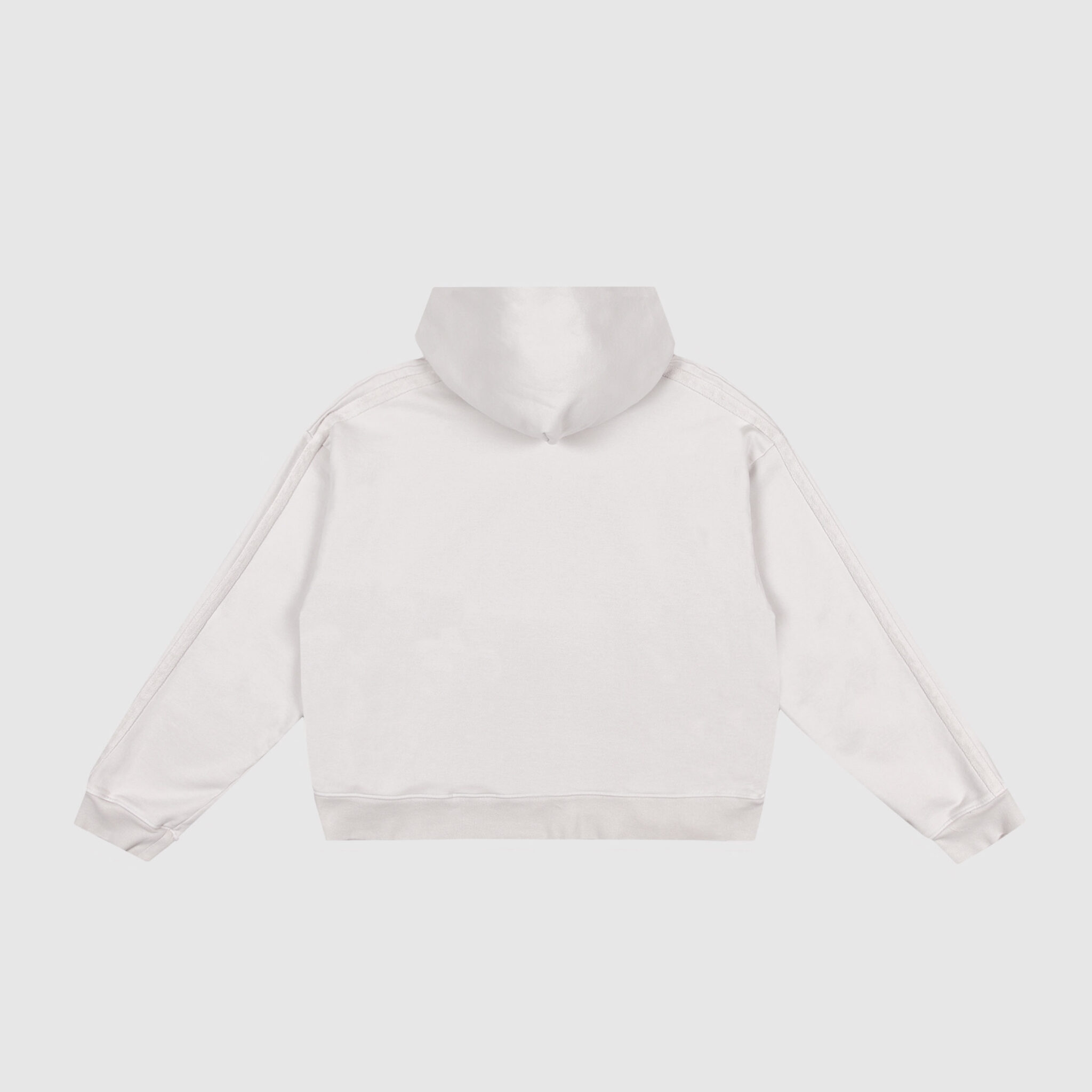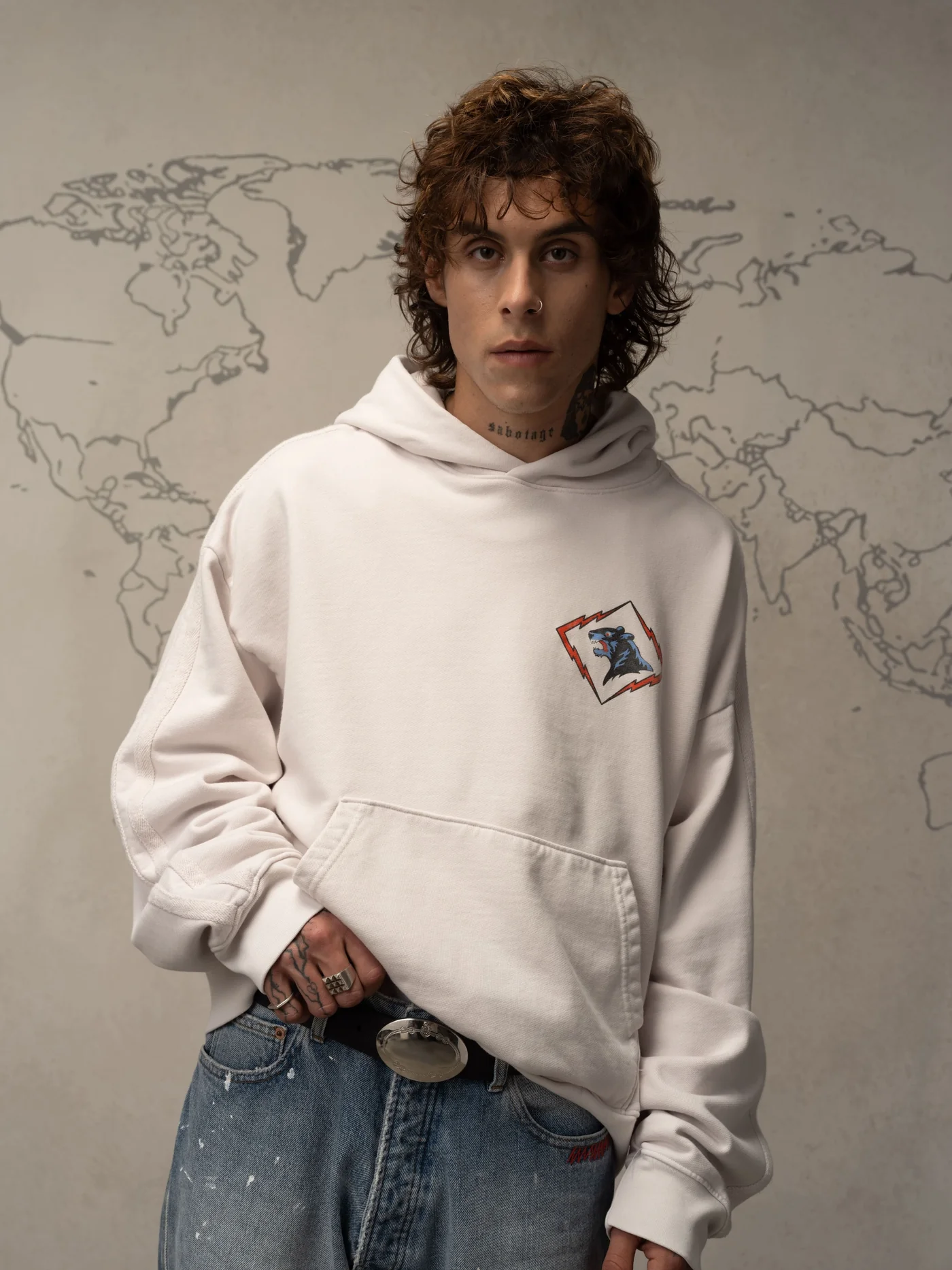 The Dead Atlantic Chapter 1 hoodie focuses on shape and feel. The overall silhouette of the Panther Hoodie is slightly cropped and oversized with full length cuffs and no drawstring on the hood. The sleeves feature a reverse self stripe to give it an iconic twist that is uniquely Dead Atlantic. The panther graphic pulls inspiration from military icons and collegiate sport logos.