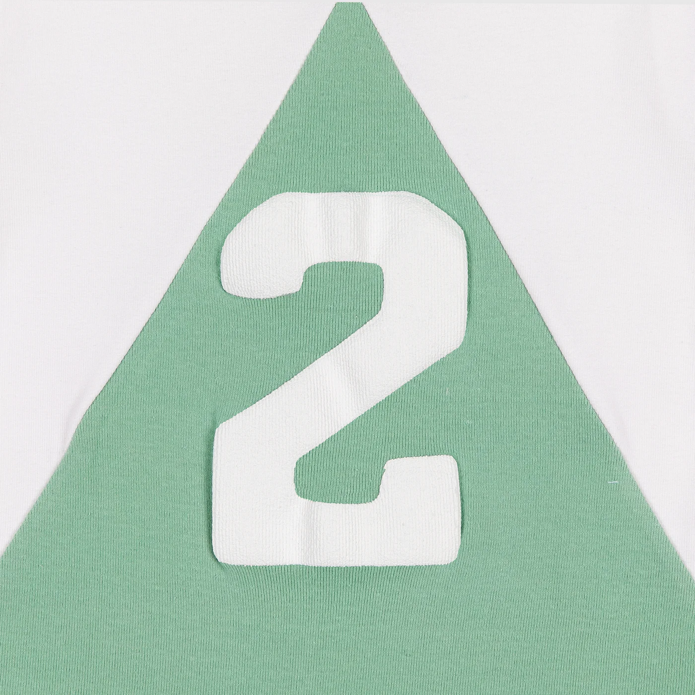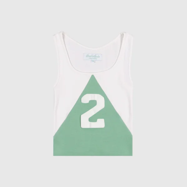 The split tank was inspired by vintage women’s athletic gear which was designed for mobility while maintaining an essence of sophisticated style. It features a two-tone triangular stitch cotton fabric with a thick puff-print “2” on the front and raw edges at the bottom.