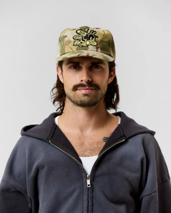 This Vintage bee logo comes from the 21st bombardment squadron that fought in WWII. “This little bee is a tough fighter and is ready for anything. He has the right spirit.” The hat body is made with washed and distressed foliage bull denim. Each one of these garments undergoes a unique wash and dye process, distressing, and fading. Each garment has its own characteristics and that is the intention.