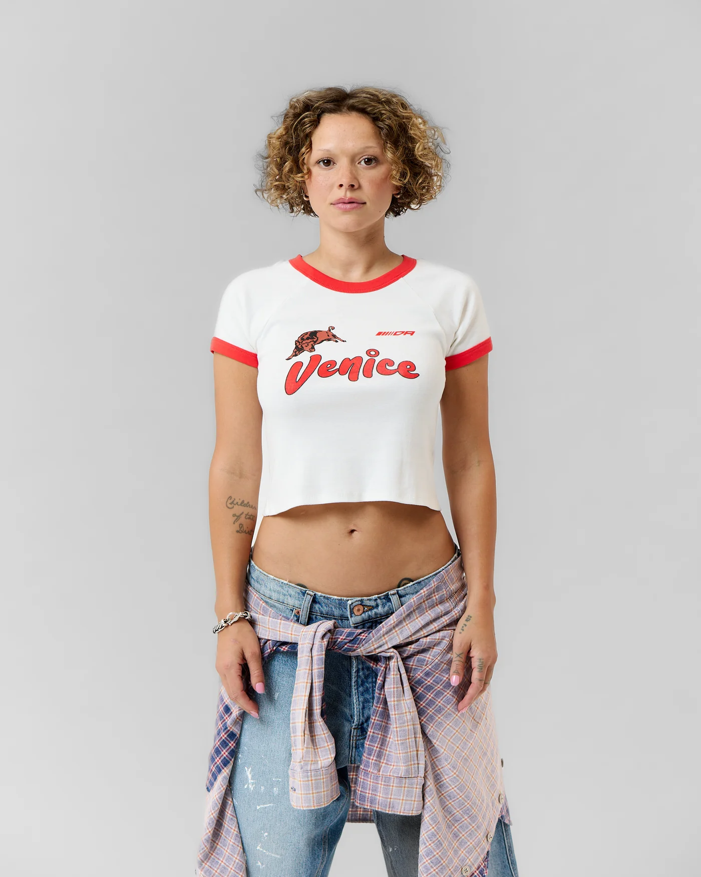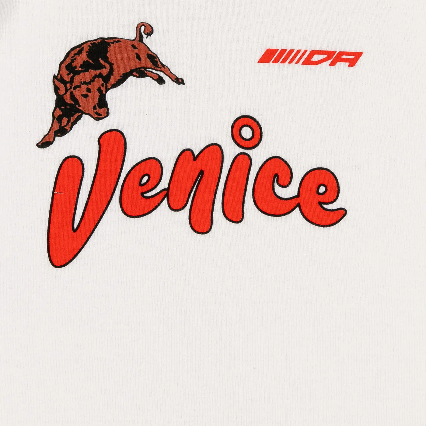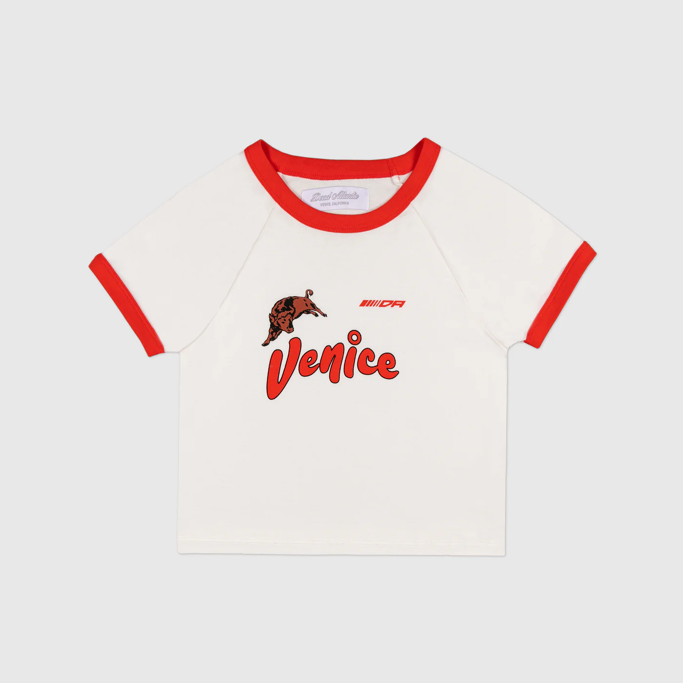 The Venice baby tee features red contrast ribbing on the cuffs and neck with a retro Venice bulls graphic and DA motorway logo.